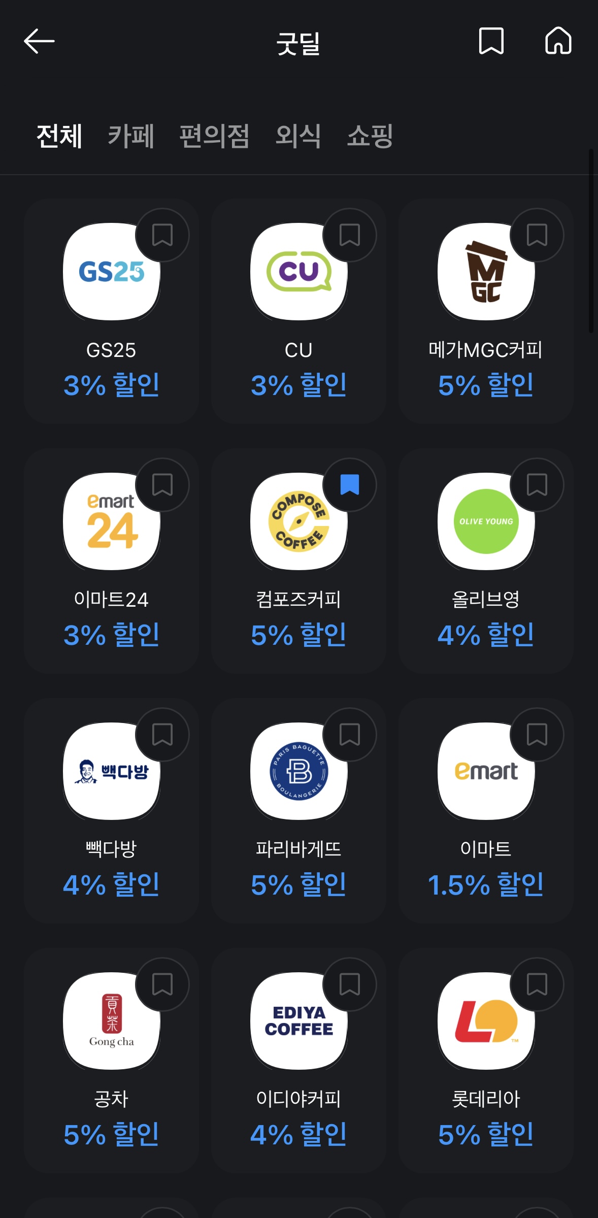 컴포즈, 투썸플레이스, 파스쿠찌, 더벤티, 할리스, 텐퍼센트 등과 같은 커피할인, 뚜레주르, 파리바게트, 베스킨라빈스, 트레이더스, 롯데마트, 이마트, 메가마트, 씨유 CU 편의점, 지에스 GS편의점, 올리브영, 등등... (엄청 많음)